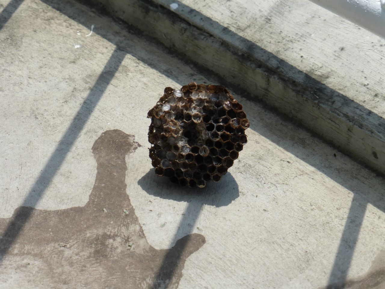 写真は、ベランダの除去前、除去後、取った蜂の巣の3枚です。